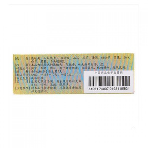 Ingredients: cooked Rehmanniae Chinese, Cornus officinalis, peony tree bark, Chinese yam, Poria, alisma plantaginaceae, wolfberry fruit, chrysanthemum shelkovitselistnaya, Tribulus Terrestris, Chinese angelica, peony belotsvetkovy, abalone (shell abalonana).
