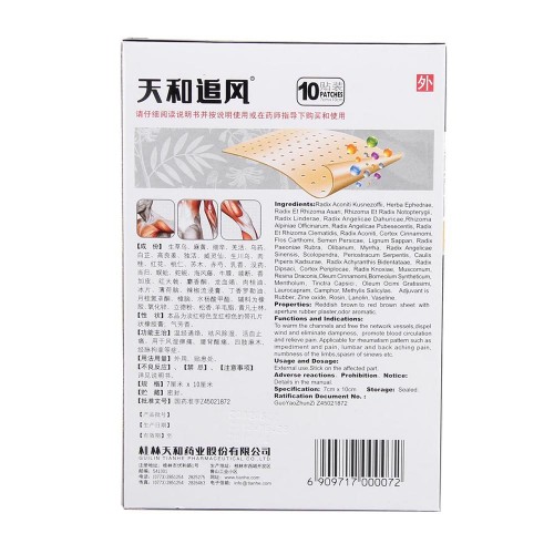 Function and indications: the patch has analgesic, anti-inflammatory, anti-edematous effect. The mechanism of action plastyryaTyanhe Chzhuyfen Gao associated with the action of more than 35 specially selected precious herbs and natural ingredients that relieve pain of various origins, improve local blood circulation arthritis, osteochondrosis, rheumatism, sciatica. The patch helps relieve headache, toothache, post-traumatic pain anywhere. Plaster is used in paralysis of limbs, as well as cramps. Suitable for all, including for very sensitive human skin. The effect is felt after a few minutes after application. Essential oils and herbs to soothe the nervous system, helps to relieve stress, muscle pain.